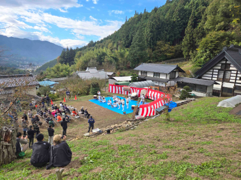 秋晴れの下、上条集落の特設会場で行われた記念式典
