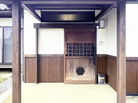 各所開口部より雨水の侵入があり染みが見られたため、外回りの木製建具をアルミサッシにして雨仕舞を改善、玄関ポーチ周りは古い蔵戸を使用するなど、古民家との調和したファサードとなるよう工夫しました。