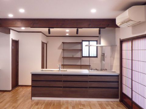 竣工キッチン。施主様の要望により背面に稼働棚を、化粧梁にはスポットライトを設置
