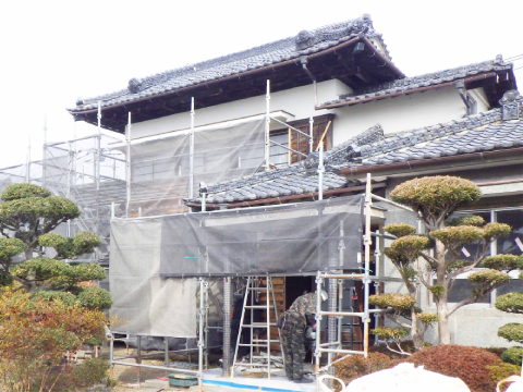 修理工事中の外部足場の様子