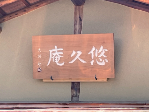妻壁に掛けられた大村智博士自筆の扁額「悠久庵」