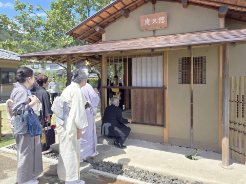 薬師寺での講演のお礼として大村博士に寄贈されたという、1300年にわたり国宝「薬師寺東塔」を支えてきた基壇の土砂や石。このたび悠久庵の芸術作品や庭石として蘇り、小間の茶庭の見所の一つとなりました。また、建物正面に掲げられた「悠久庵」の扁額には、過去から現在そして未来へとこの地で末永く続いてほしいとの思いが込められています。