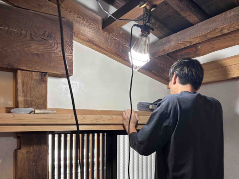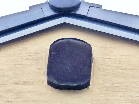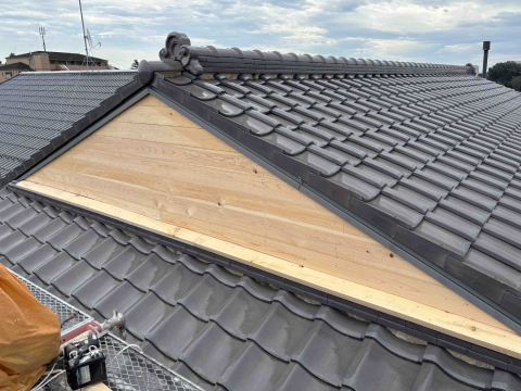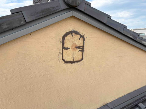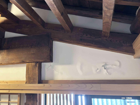 2006年に完成したS邸。約20年の歳月を経て、妻壁より雨水が侵入し漆喰の内壁が膨れて剥離する事態が発生しました。調査してみると妻壁に突出している棟木のカバーが2024年以前の大風で損傷変形して雨漏れが起こったことが判明し、幸い保険金が下りることとなり修理工事が行われました。