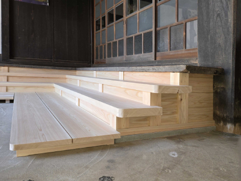 完成した大土間の上り段、桧(ヒノキ)の香りが爽やか