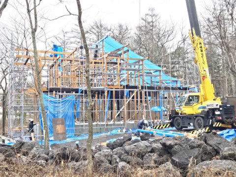 軽井沢の森の中に、新しい住宅のフレームが完成