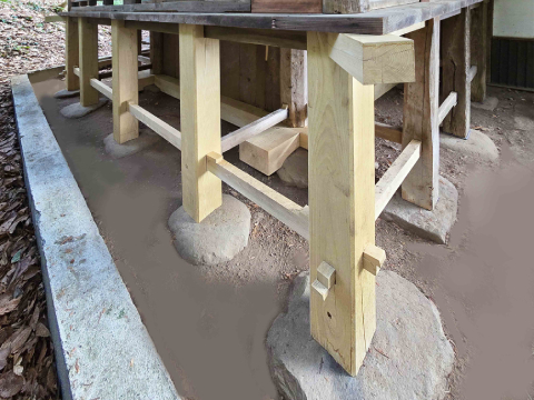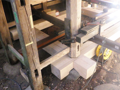 改修工事に際しては、本殿が後の時代に行われた改築により拝殿と一体となっているため、ジャッキアップが容易でないことから、曳屋工事で鉄骨(レール)を組み、わずかばかりの揚屋(あげや)を行いこれを保持、地覆(じふく)土台などの取り替えを行いました。新材に取り替えた地覆土台は石づきを取って、新材の高欄柱もやはり石づきを取って礎石の上に下ろし、地貫で固めました。