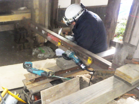 工事の様子。曳家工事で本殿を礎石から浮かし保持